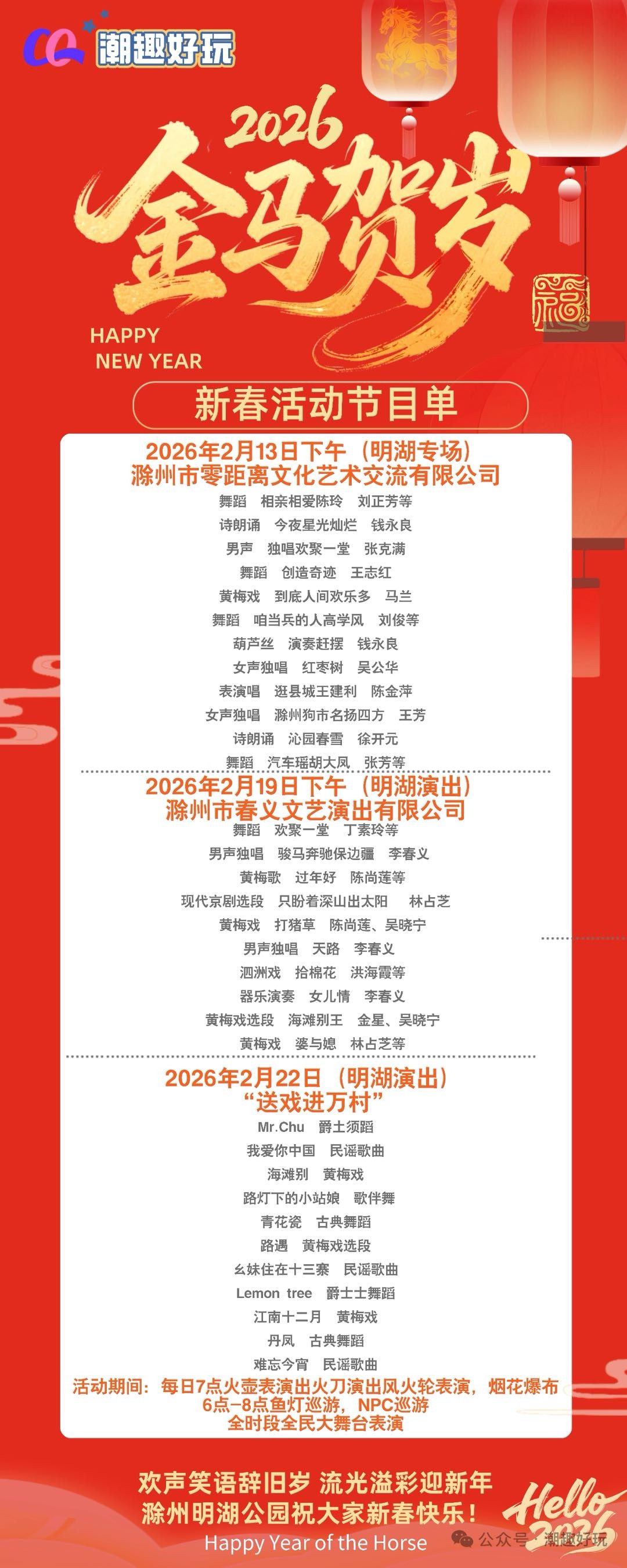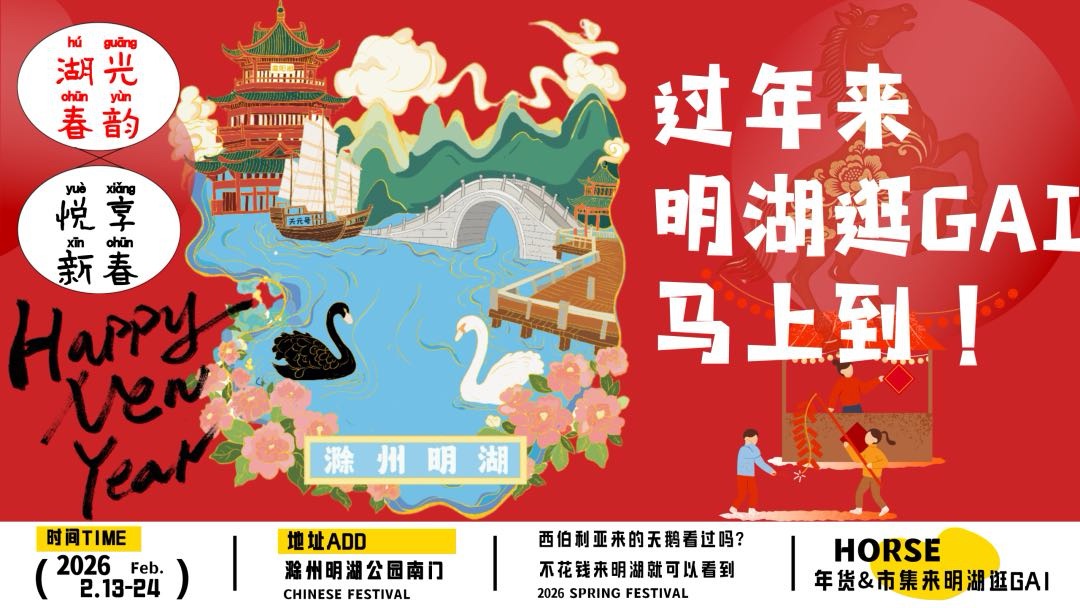 春节期间舞台活动表演不停,每天都有不一样的节目呈现给各位游客喂!-文旅喊您过年来明湖逛GAI好,马上到!南谯区 2026 年春节明湖公园美食游乐观天鹅文化活动预告 活动时间:2月13日 - 2月24日(腊月二十八-正月初八) 特色美食、地方年货、非遗手艺人、助农产品、全民游乐同步开启 特色非遗与互动活动非遗打铁花、烟花瀑布:2月13-24日 20:00-20:50包含打铁花、喷火、火壶、冷烟花瀑布等表演。有奖环节:2月16日 - 2月20日 20:00-21:00参与即送福利环节:电动车、电器、消费券、文创纪念品等九龙炮、舞台表演:2月13日 - 2月24日 19:00-19:30观赏类表演与文旅舞台演出轮番上演。NPC 巡游、鱼灯巡游:2月13日 - 2月24日 15:00-21:00隐藏福利:2 月 13 日 - 2 月 24 日 每天不定时开启全民大舞台模式。 文艺演出专场明湖专场(滁州市零距离文化艺术交流有限公司)时间:2 月 13 日下午综合场(滁州市春义文艺演出有限公司)时间:2 月 19 日下午更多精彩演出陆续通知中,关注明湖微信、公众号