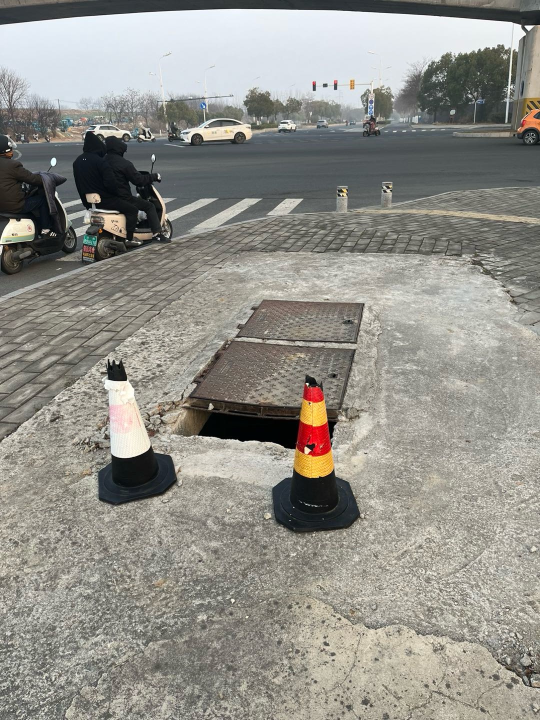 扬子大道与苏滁大道交叉口,这个洞缺少盖板挺长时间了,洞很深,麻烦小编帮忙联系