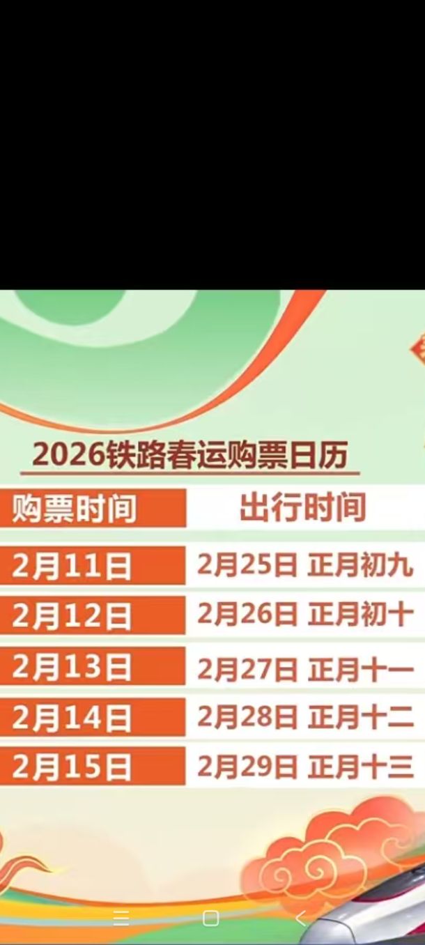 2026年铁路春运返程高峰的购票时间表,精准对应15天的预售规则。根据日历显示,2月11日可购买2月25日(正月初九)的返程车票,2月12日对应2月26日(正月初十),2月13日对应2月27日(正月十一),2月14日对应2月28日(正月十二),2月15日则可购买2月29日(正月十三)的车票。上述出行日期均处于春节后返程客流的核心时段,车票供需紧张。有返程计划的旅客,建议通过铁路12306网站、手机App等官方渠道,提前做好行程规划并及时锁定车票,避免耽误节后复工与出行安排。