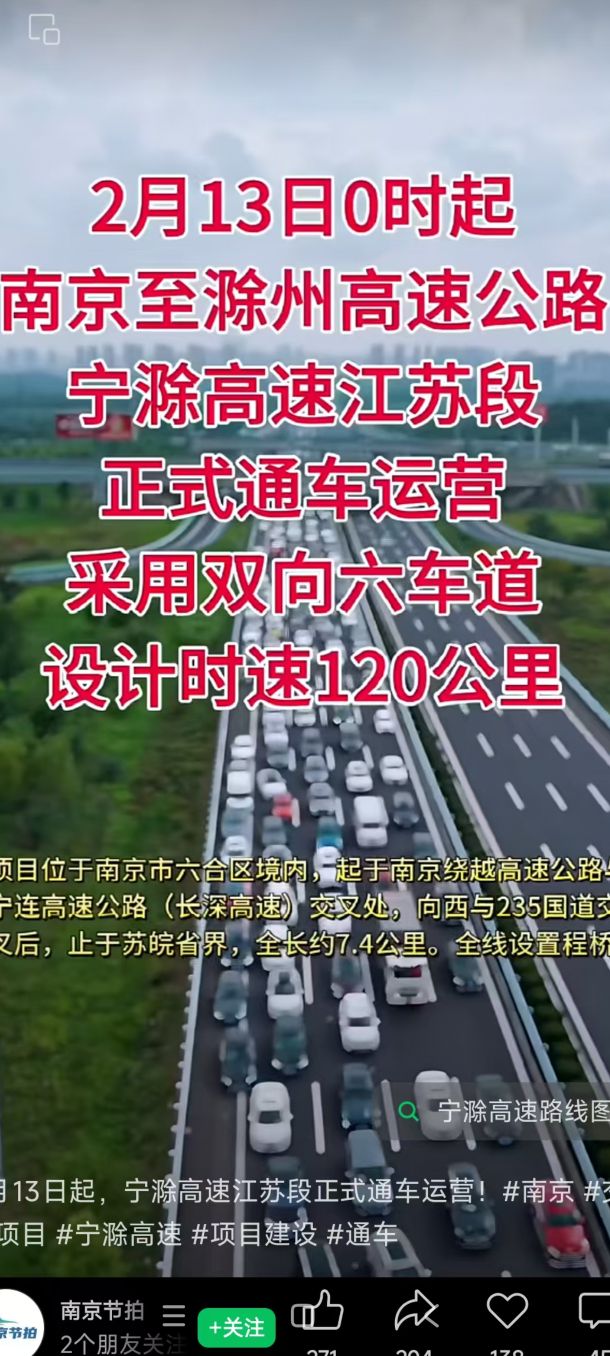 重磅消息!2月13日0时起,宁滁高速江苏段正式通车运营!这条双向六车道、设计时速120公里的交通新动脉,起于南京六合程桥枢纽,向西与235国道相交后,止于苏皖省界,全长约7.4公里。它的开通,不仅能有效分流宁洛高速车流,显著缓解八卦洲长江大桥及雍六高速的过境交通压力,更将彻底拉近南京与滁州的时空距离,为宁滁双城通勤、产业协作和周末短途游提供更高效的选择,让长三角一体化发展的“加速度”,实实在在地铺展在每一次畅行的车轮之上。