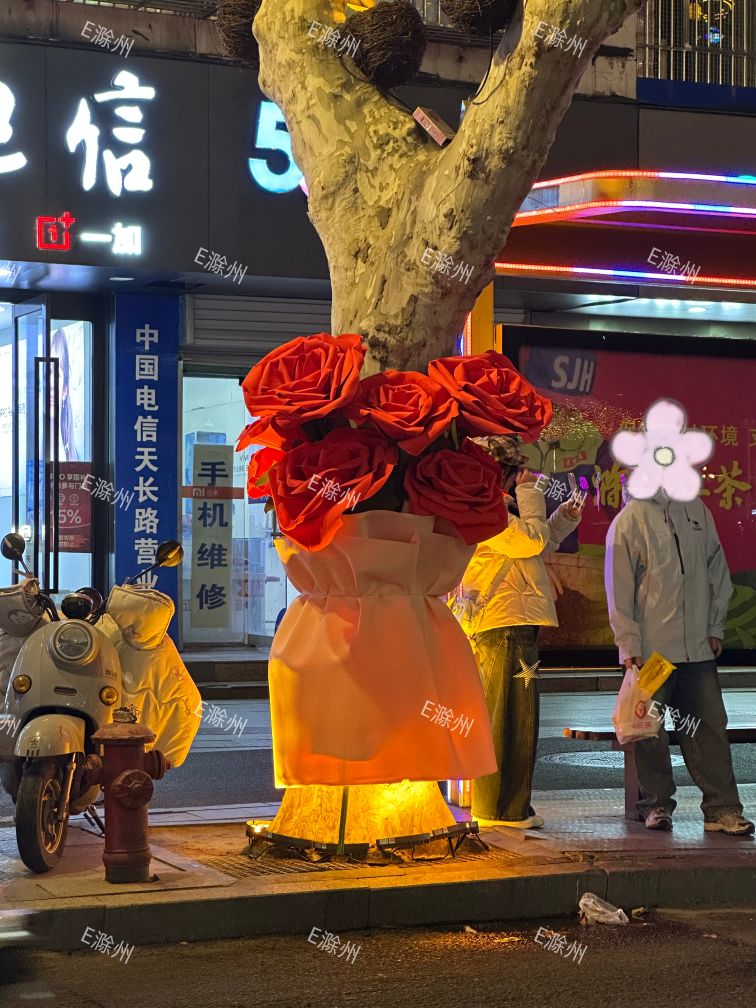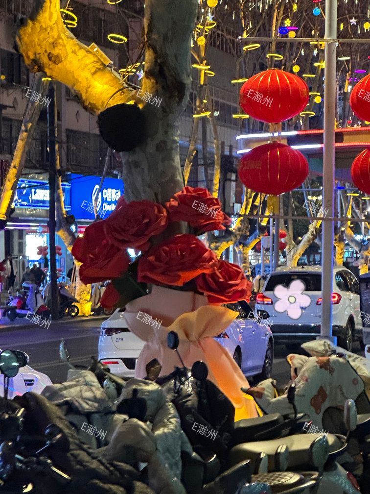 滁州天长路的梧桐树穿新衣了,绑上大大的玫瑰花装饰品,氛围感满满!