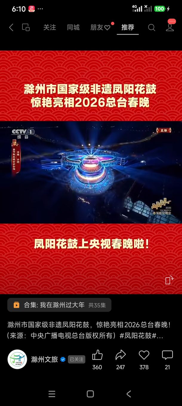 锣鼓铿锵传捷报,乡音袅袅上春晚!国家级非物质文化遗产凤阳花鼓惊艳亮相2026年总台春晚合肥分会场,用千年非遗的魅力点亮了全国观众的团圆夜。这份荣耀的背后,是安徽省老体协七年如一日的坚守与推广,让凤阳花鼓健身操走进千家万户;更离不开凤阳县委宣传部、教育及文旅部门的鼎力扶持与悉心培育。如今,凤阳花鼓名扬天下,不仅成为了滁州文旅的闪亮名片,更让家乡安徽滁州的文化底蕴响彻全国!身在滁州过大年,这份属于家乡的骄傲,值得我们每一个人点赞喝彩!