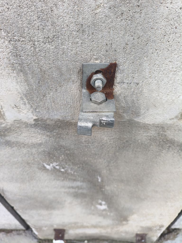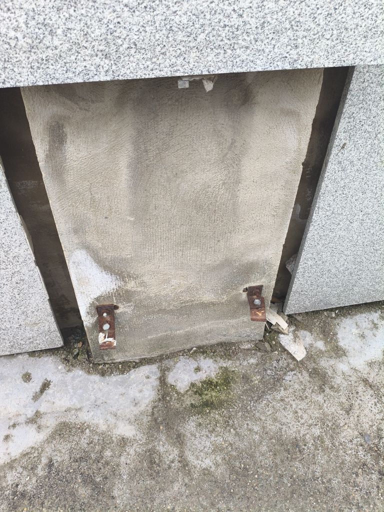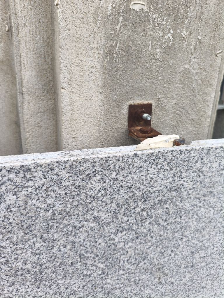 首先,这种工艺存在突出的结构安全风险。从图片中可以清晰看到,用于固定石材的金属挂件和螺栓已经出现严重锈蚀,长期下去必然会大幅削弱结构强度,存在石材脱落伤人的重大隐患。同时,基层墙体与石材之间形成的密闭空腔,极易积水,不仅会加速金属件的腐蚀,还会导致墙体返潮、发霉,进一步破坏建筑结构的稳定性。