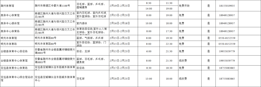 为营造欢乐祥和的节日氛围,更好满足广大市民群众春节假期的健身需求,在农历马年春节假期期间,安徽省多地公共体育场馆免费或低收费开放。滁州多处上榜!