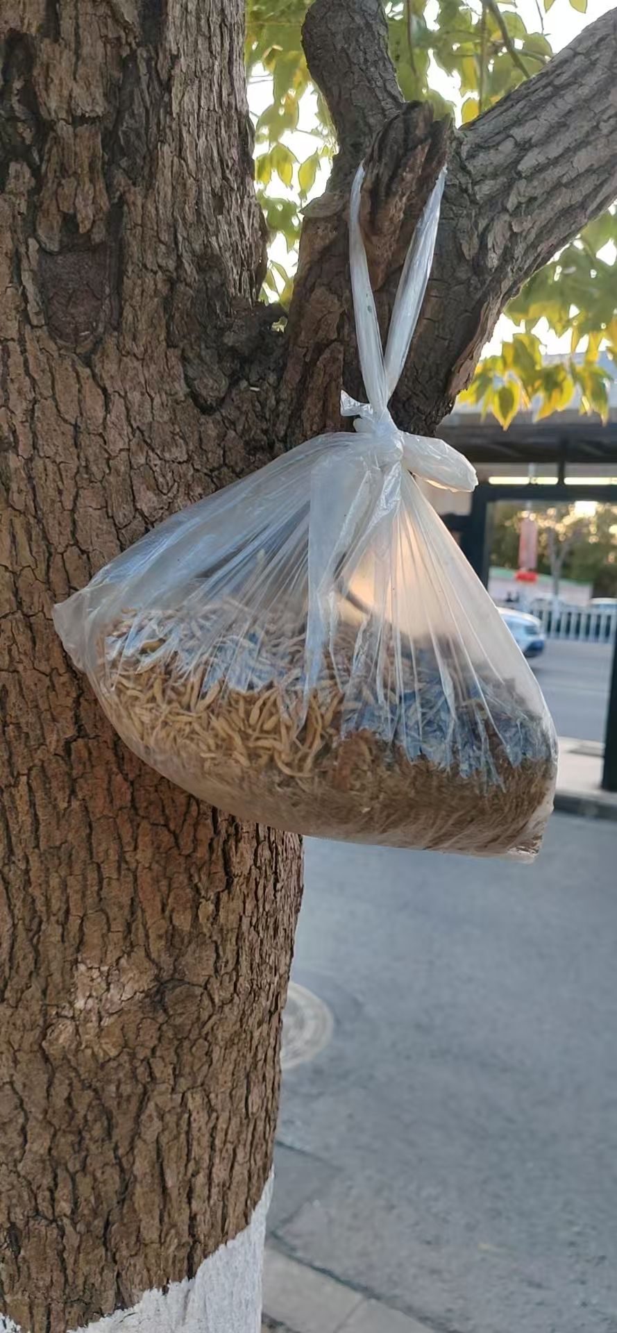 在滁州市花博园大门对面(花博园东门公交站台后方)的行道树上,现悬挂有一个透明塑料袋,袋内装有黄褐色条状及粉末状物品,疑似中药材或干货。该物品用白色塑料袋系于树杈之上,位置较为显眼。