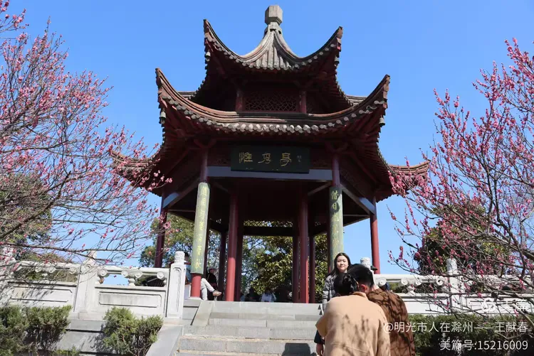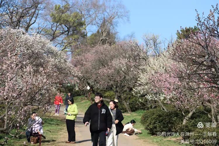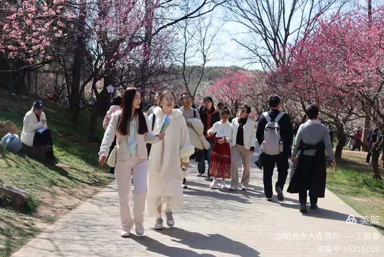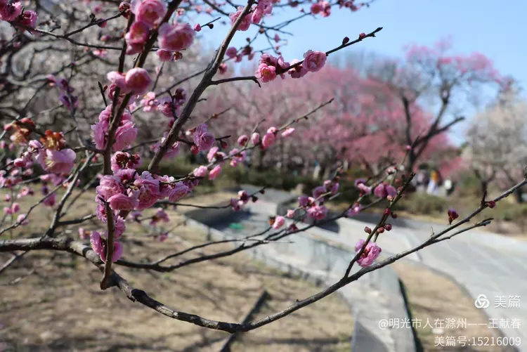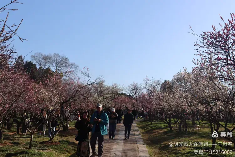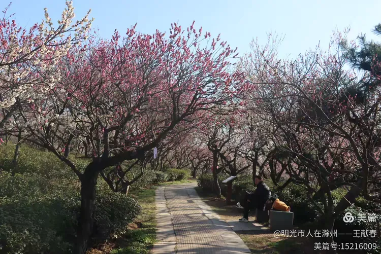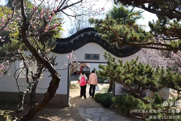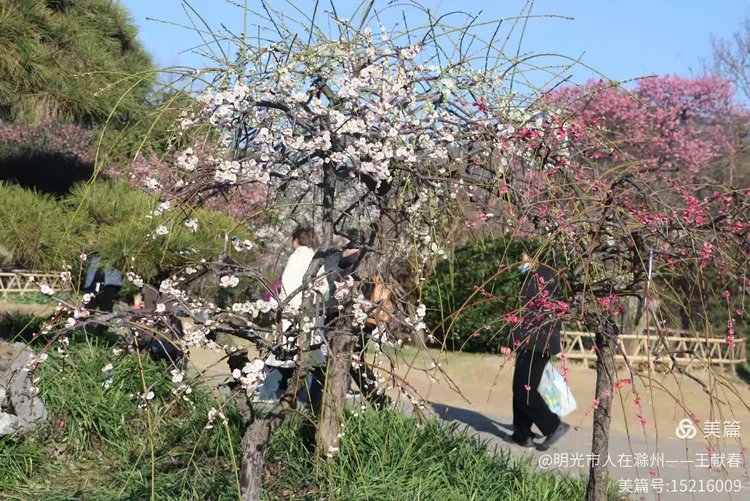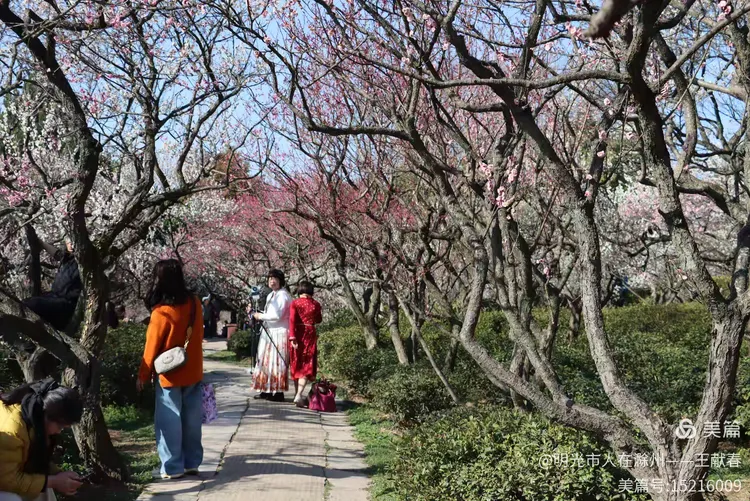 再往里走,梅道渐深。那条被花枝拱成天然穹顶的小径,我太熟悉了——两旁梅花开得正盛,粉的娇而不艳,白的净而不冷,风过时,细瓣如雪簌簌飘落,肩头、发梢、相机镜头上,都沾了春的碎影。几位游客缓步而行,有人驻足仰拍,有人倚着长椅闭目闻香,还有孩子踮脚去够低垂的花枝,笑声清脆,惊起枝头一只灰背山雀,扑棱棱飞进远处的蓝天里。