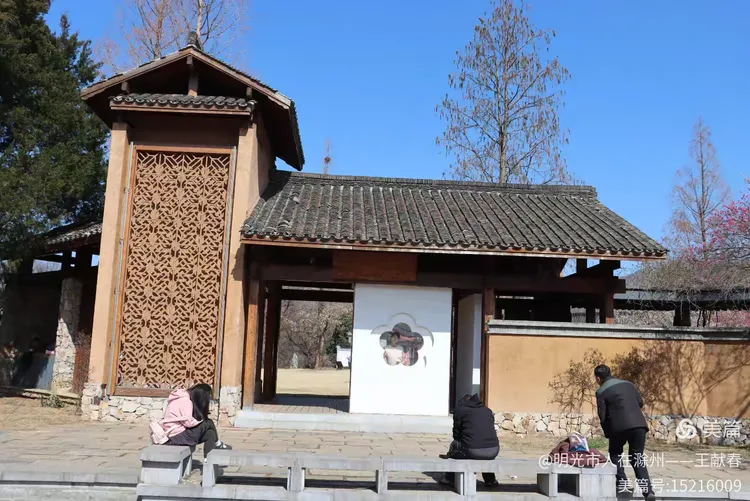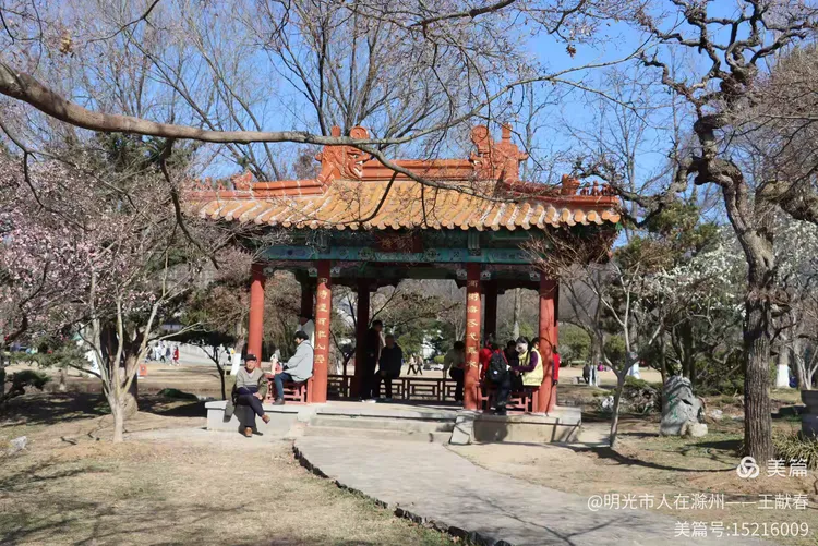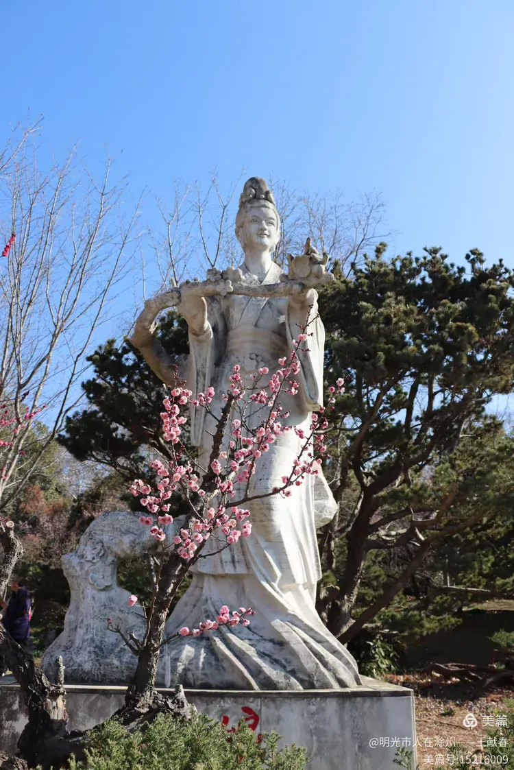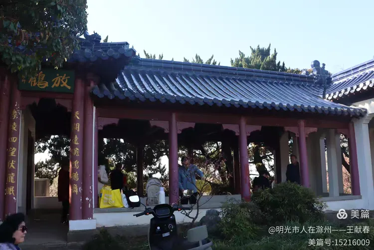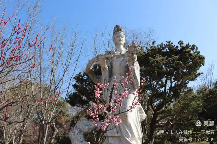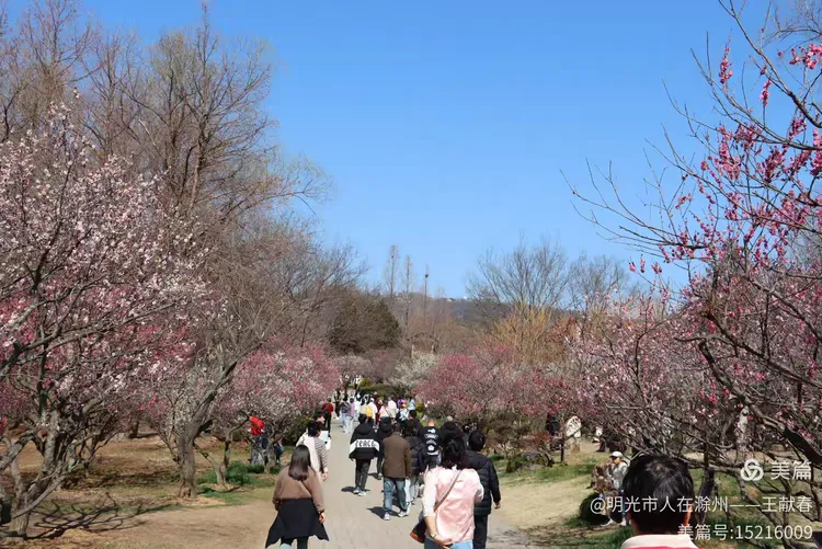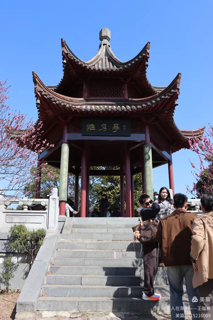 再往里走,梅道渐深。那条被花枝拱成天然穹顶的小径,我太熟悉了——两旁梅花开得正盛,粉的娇而不艳,白的净而不冷,风过时,细瓣如雪簌簌飘落,肩头、发梢、相机镜头上,都沾了春的碎影。几位游客缓步而行,有人驻足仰拍,有人倚着长椅闭目闻香,还有孩子踮脚去够低垂的花枝,笑声清脆,惊起枝头一只灰背山雀,扑棱棱飞进远处的蓝天里。
