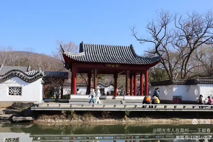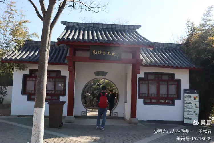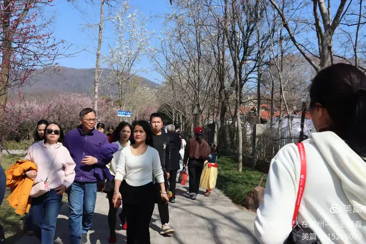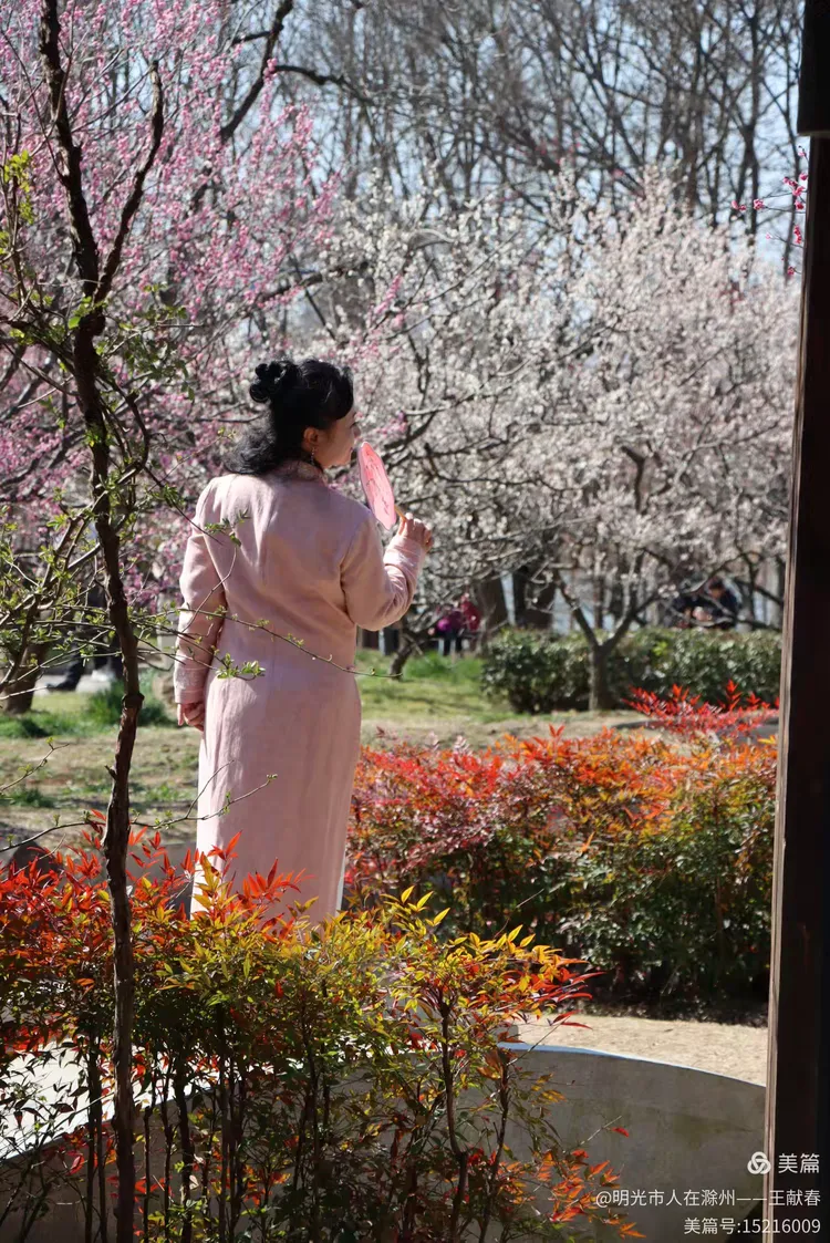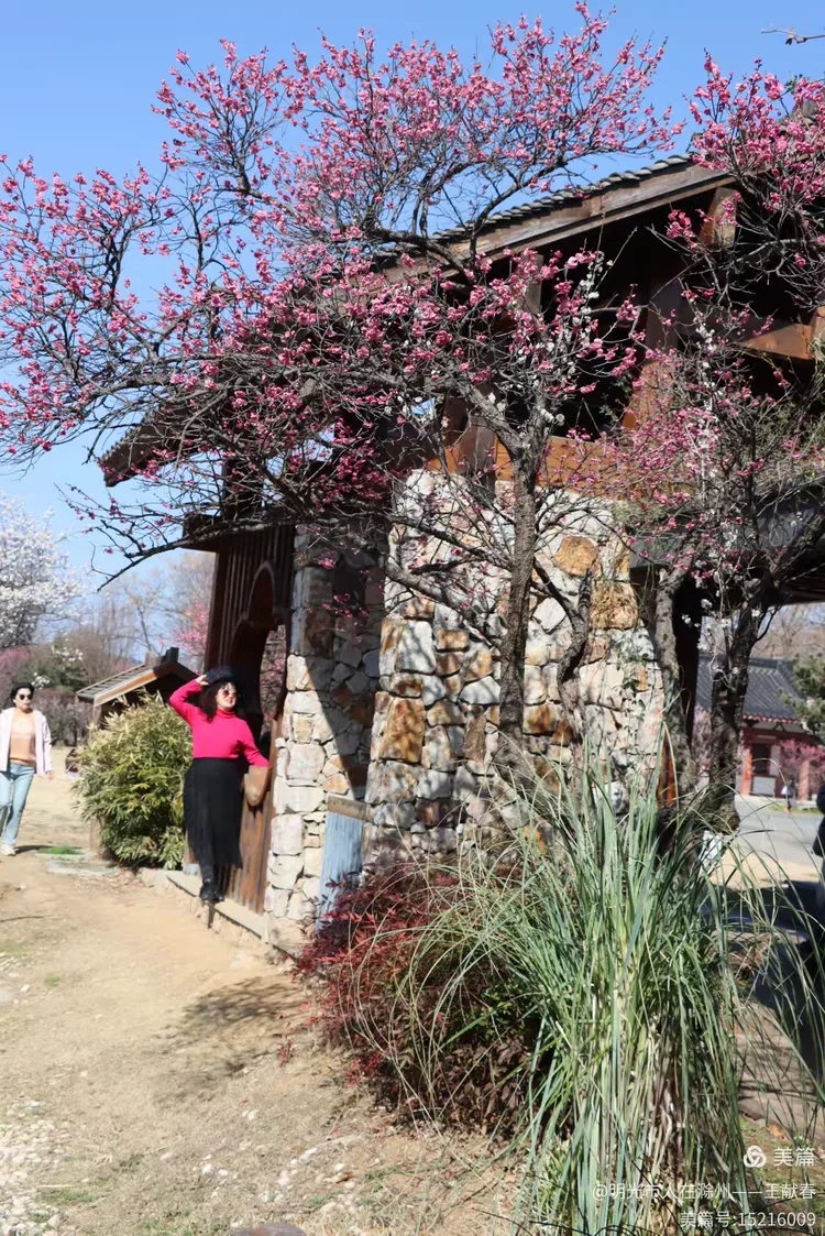 午后踱至红楼艺文苑附近,一座飞檐翘角的中式亭子掩映在花影中,红柱青瓦,檐下悬着几盏未摘的红灯笼,风一吹,轻晃如心跳。亭中三两游人歇脚闲谈,一位穿粉色外套的姑娘低头看手机,发梢沾着花瓣,像从宋人小品画里走出来的;不远处,一位戴墨镜的女士正对着镜头比出“V”字,身后是整片云蒸霞蔚的梅林,蓝天澄澈,山影淡远——这画面,我去年拍过,前年也拍过,可每次看,都像第一次见。