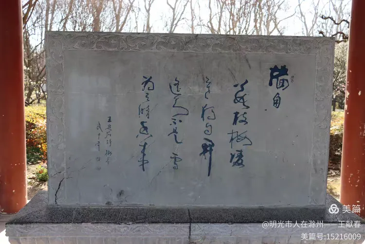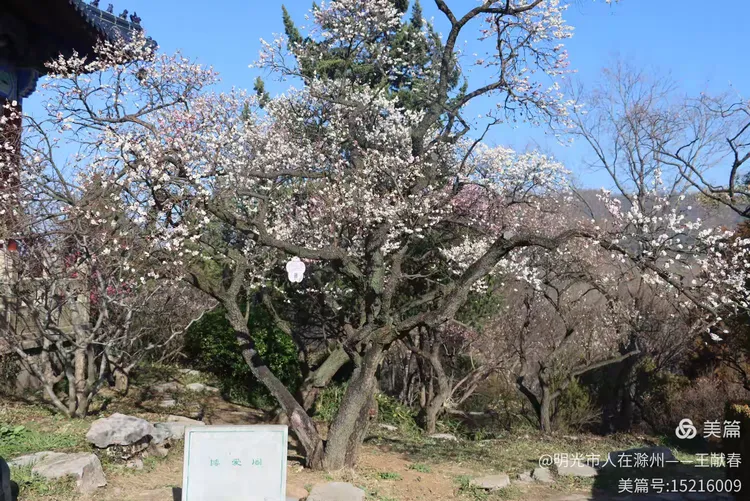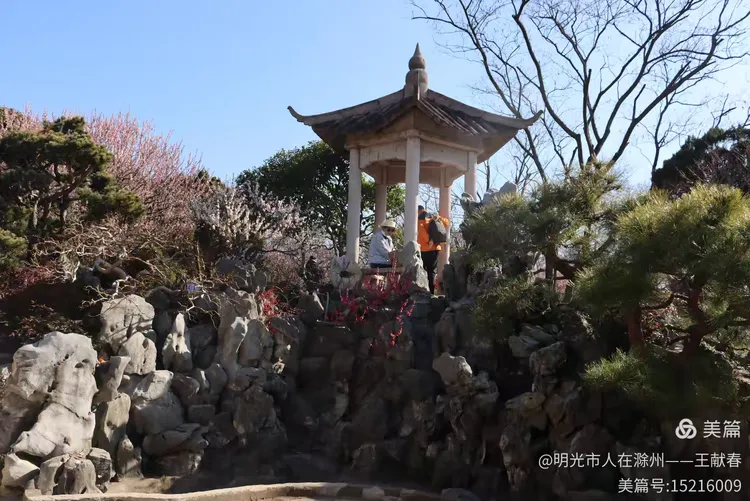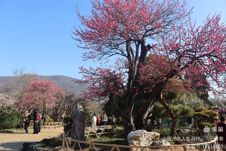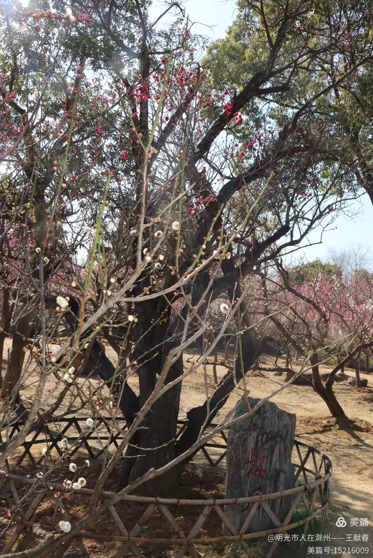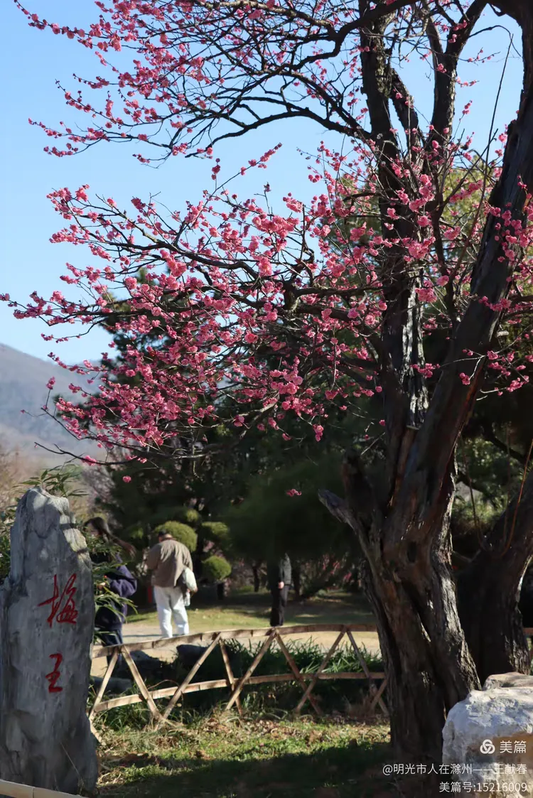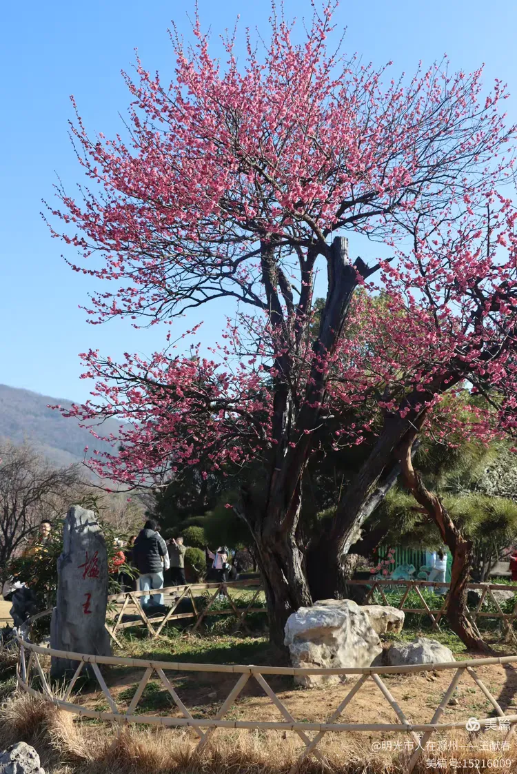 我拐进观梅轩旁的小坡,那里有一棵老梅,树干虬曲如龙,树皮皲裂却生机勃发,枝头缀满“南京红”,花瓣厚实,红得沉静又热烈。树下立着一块石碑,刻着“梅王”二字,字迹被岁月磨得温润,旁边还卧着几块青石,像几位老友,年年守着这树、这山、这春。我蹲下拍它,阳光正巧穿过枝隙,在碑面投下晃动的光斑,仿佛时间也在此处慢了半拍。