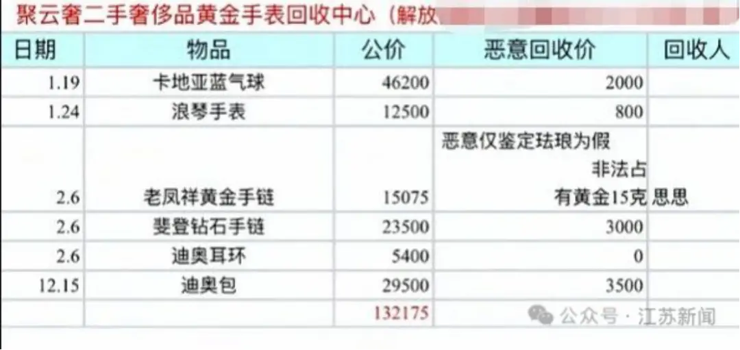 统计显示,包含手表、包包、首饰在内,总价 132175 元的物品,最终合计仅卖出9300 元,与正常二手回收价差距悬殊。