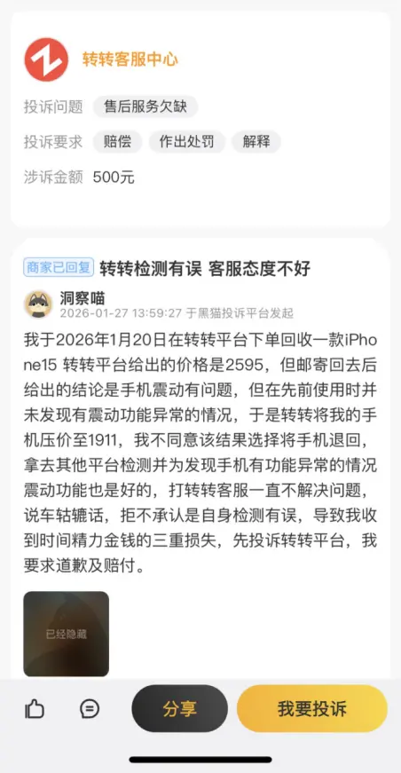 有消费者反映,其在2026年1月通过转转回收一台iPhone 15,平台预估价格为2595元,但邮寄质检后却称“手机震动功能有问题”,将价格下调至1911元。消费者选择退回手机,并在其他平台检测,发现震动功能完全正常。
