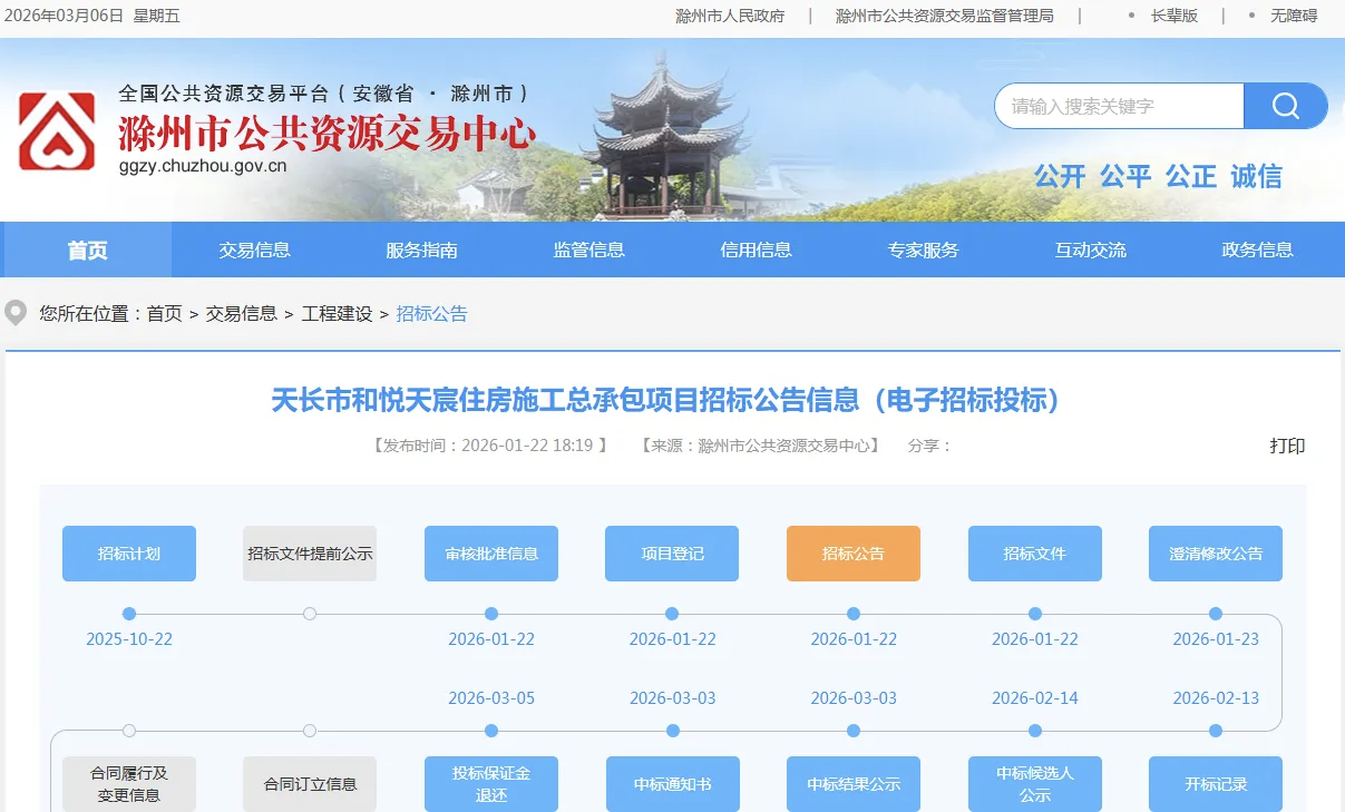 2026年3月5日消息,天长市总投资约12.8亿元的和悦天宸住房施工总承包项目招标落幕,由本土标杆企业安徽中南天开建设集团牵头、央企中铁十九局协同的联合体中标,中标金额约10.77亿元,该项目是天长市2026年重点民生工程,也为当地 “十五五” 发展目标注入民生动能。
