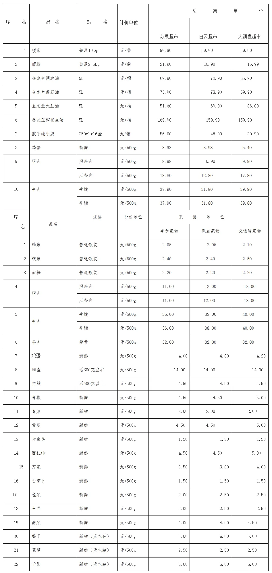 滁城主要超市和农贸市场民生商品