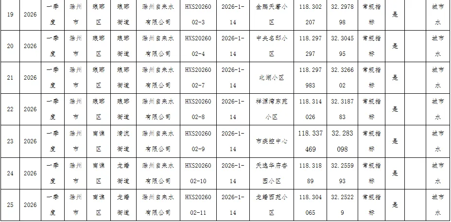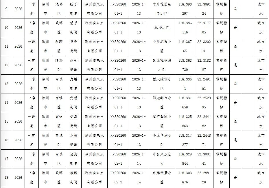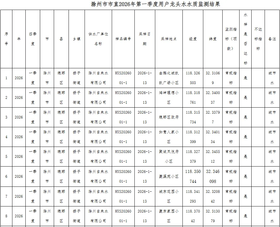 2026年滁州市第一季度用户龙头水质监测结果公示