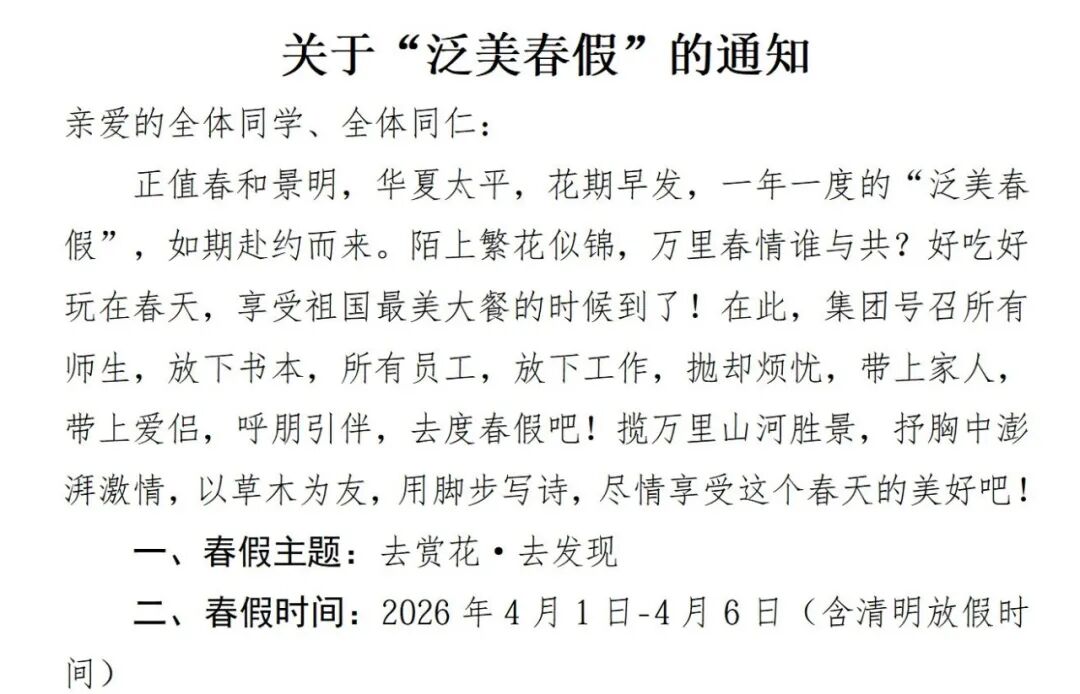 日前,天长泛美航空中等职业技术学校官网发布一则《关于“泛美春假”的放假通知》。学校决定2026年4月1日-4月6日(含清明放假时间)全校放假,连续六天。