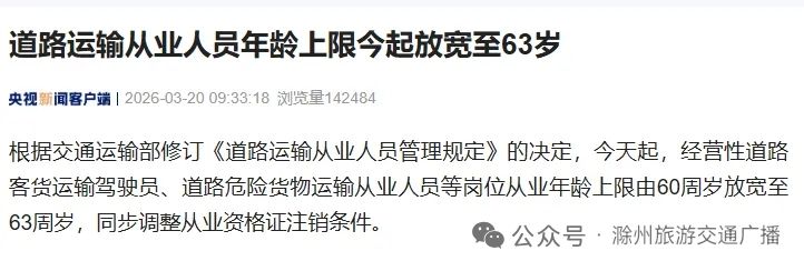 根据交通运输部修订《道路运输从业人员管理规定》的决定,今天起,经营性道路客货运输驾驶员、道路危险货物运输从业人员等岗位从业年龄上限由60周岁放宽至63周岁,同步调整从业资格证注销条件。