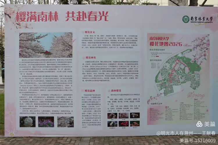 南京林业大学的樱花,附品种、花期、核心观赏点与预约提示(2026最新参考):核心场地樱花大道(老图书馆—生物技术大楼),全长215米,有80余株、十余个品种,多为1964年左右定植的60年老树,是校园标志性赏樱区;樱花大道最初种的是合欢树,因虫害严重才更换为樱花,逐渐形成如今的“樱花隧道”景观;南林也是国内樱花研究与花期预报的重要机构。另有老图书馆转角、教五楼、新青年广场、主楼南北侧等点位可赏。主要品种&花期:1.东京樱花(早樱,樱花大道主力):3月中下旬至4月初盛,花白色为主,花梗有毛;2026盛花期为3月22—30日。2.山樱花:3月下旬,白/淡粉,花梗无毛,常带少量绿叶,分布于樱花大道、图书馆旁。3.日本晚樱:4月中上旬,重瓣粉/白,有香气,叶缘带长芒,见于主楼两侧、老操场南。4.另有飞寒樱、胭脂绯、郁金(绿樱)等特色品种点缀。