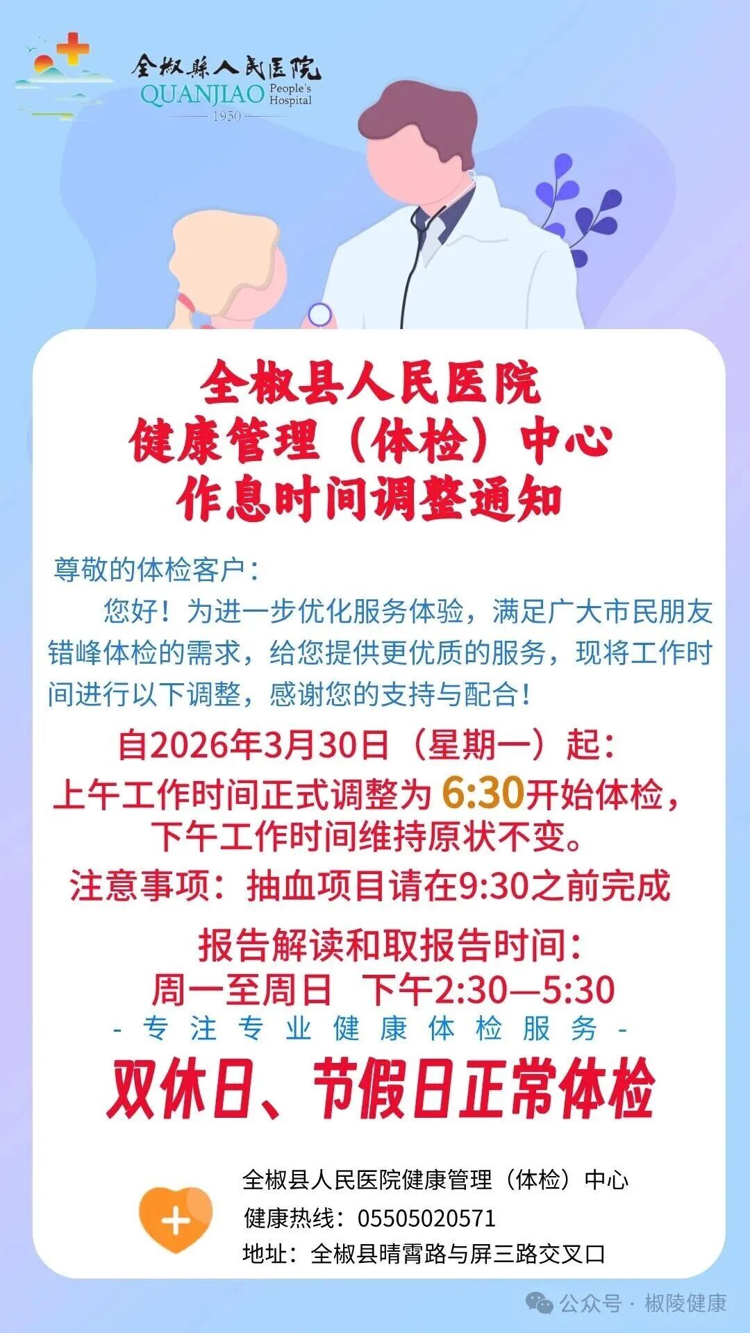 您好!为进一步优化服务体验,满足广大市民朋友错峰体检的需求,给您提供更优质的服务,全椒县人民医院现将工作时间进行以下调整,感谢您的支持与配合!